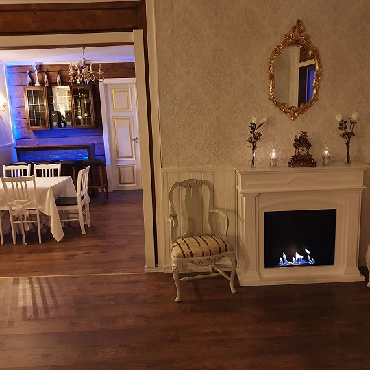 Tunnelmalliset hirsiseinät luovat hienon vanhanajan tunnelman koko tilaan. Kattokruunut ja seinälampetit tekevät valaistuksesta lämminhenkisen.